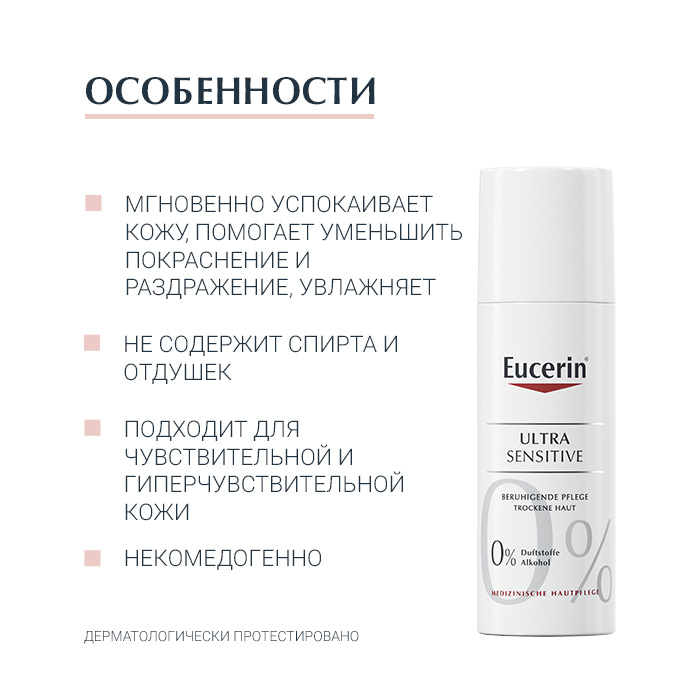 Средство обладает текстурой эмульсии белого цвета. Крем UltraSENSITIVE мгновенно успокаивает гиперчувствительную кожу и дарит ей длительный комфорт. Обладает «чистым» составом: крем содержит ограниченное количество ингредиентов. Упаковка оснащена двойным клапаном для защиты от загрязнения. Подходит в качестве основы под макияж, быстро впитывается.