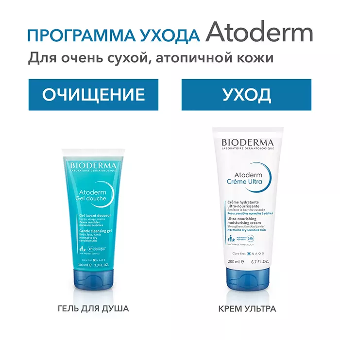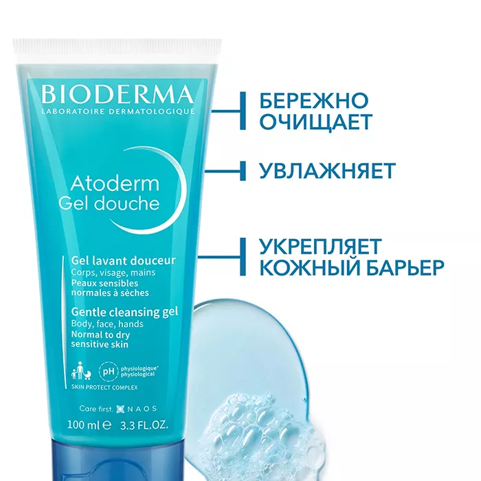 Биодрма Атодерм Гель для душа мягко очищает кожу, смягчая и защищая её. Показан в том числе и пациентам с атопическим дерматитом.