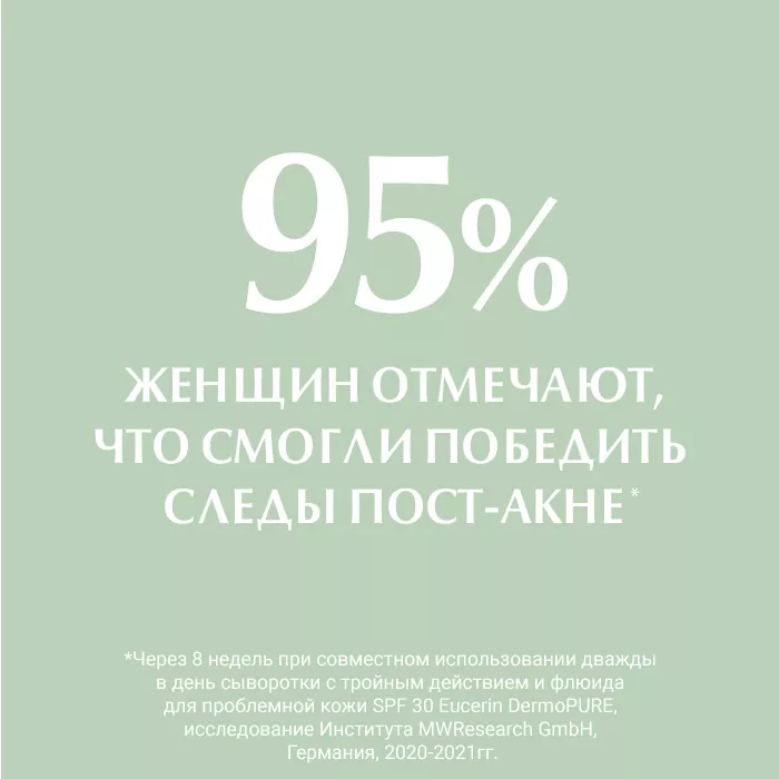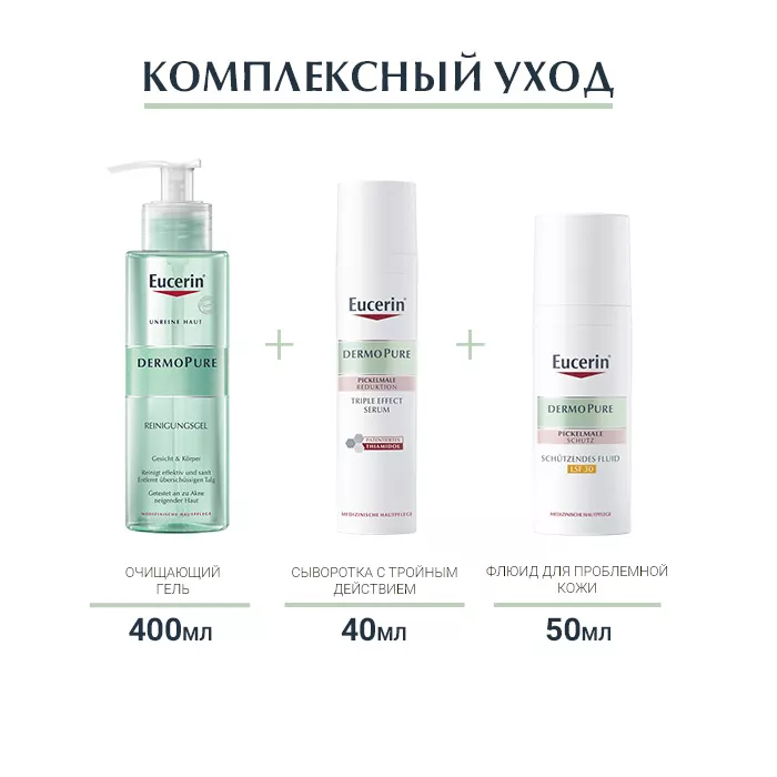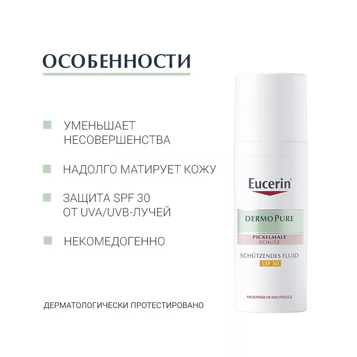 Eucerin DermoPURE флюид для проблемной кожи SPF30 создан для жирной и проблемной кожи, склонной к акне и постакне (поствоспалительной гиперпигментации). Предназначен для взрослых и подростков с 14 лет.