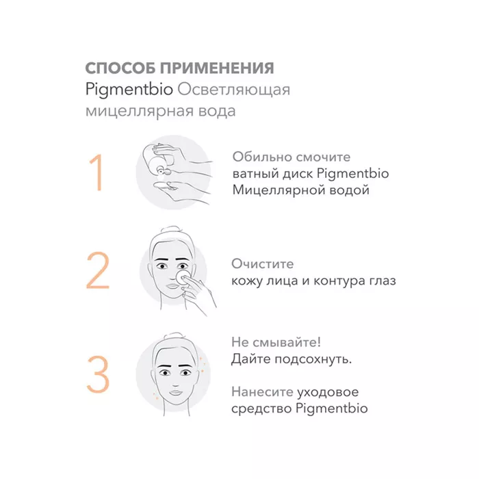 Обильно смочите ватный диск Bioderma Pigmentbio H2O и очистите кожу лица и контура глаз, дайте подсохнуть.