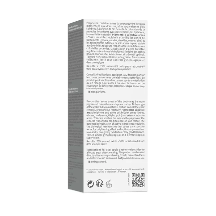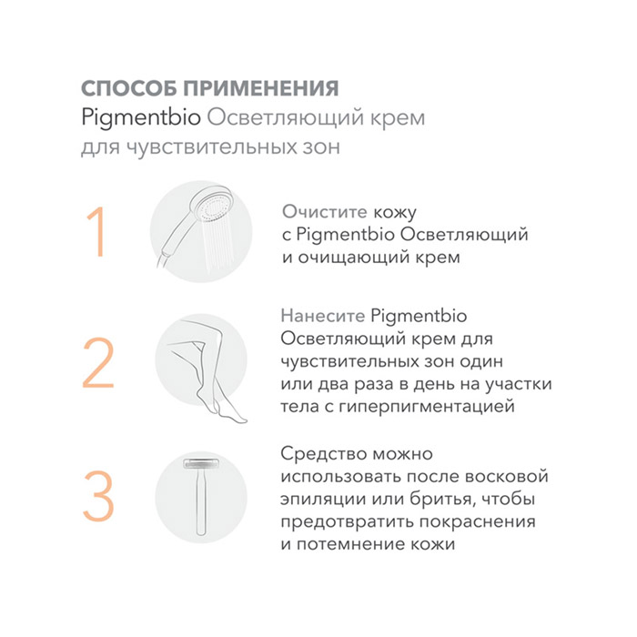 Наносите Bioderma Pigmentbio Sensitive areas один или два раза в день на предварительно очищенные участки тела с гиперпигментацией (колени, локти, подмышечные впадины, бёдра, зона бикини).