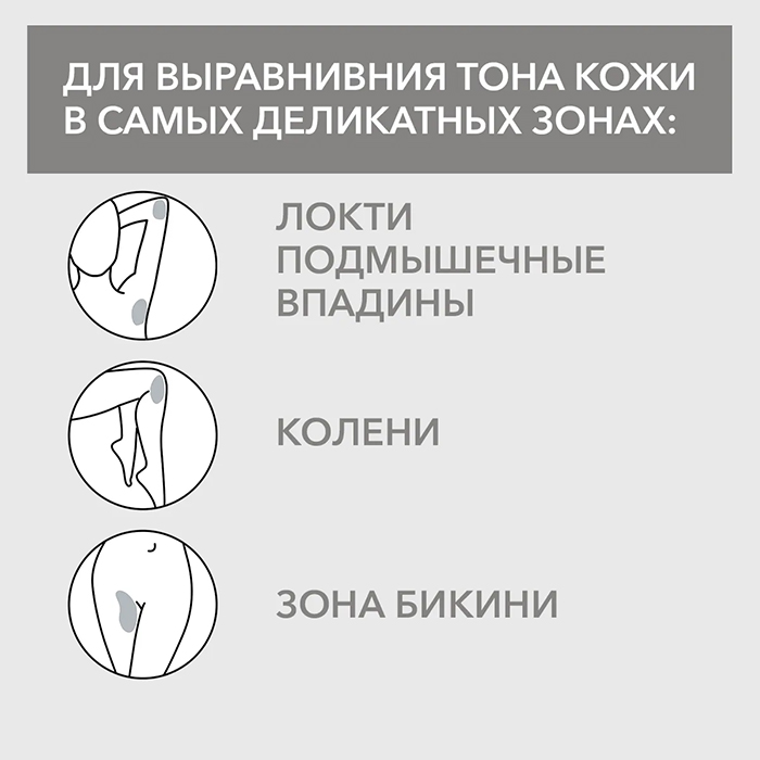 - Эффективно воздействует на гиперпигментацию и хорошо переносится кожей, что позволяет применять средство на самых деликатных участках тела