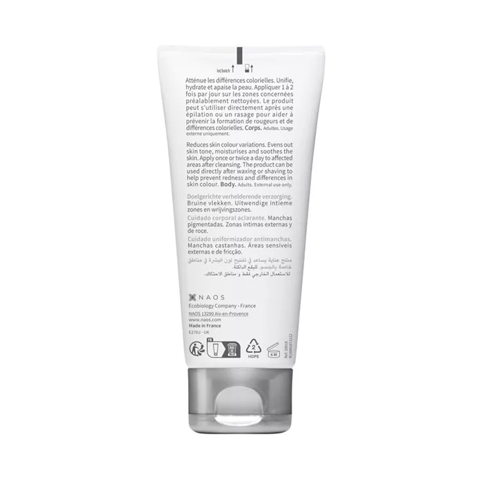 - Осветляет гиперпигментацию, вызванную трением об одежду, после эпиляции или в случае, если есть предрасположенность кожи к появлению гиперпигментации