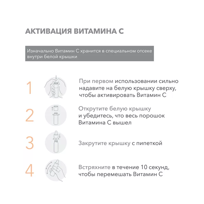 Перед применением Bioderma Pigmentbio C-Concentrate необходимо смешать два компонента средства. Для этого добавьте порошок из крышки в основной флакон и встряхните несколько раз, чтобы смешать. Готовый состав рекомендовано наносить по 5 капель каждый вечер в течение 1 месяца на лицо, шею и зону декольте на кожу, предварительно очищенную с помощью очищающего крема Пигментбио.