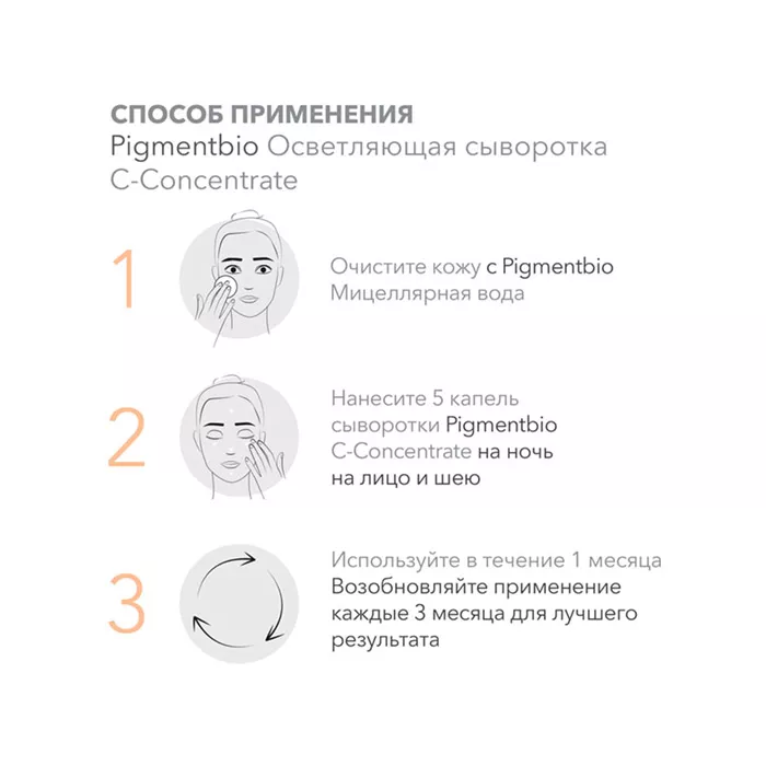 Сыворотку можно применять самостоятельно или в сочетании с осветляющим восстанавливающим ночным кремом Пигментбио.