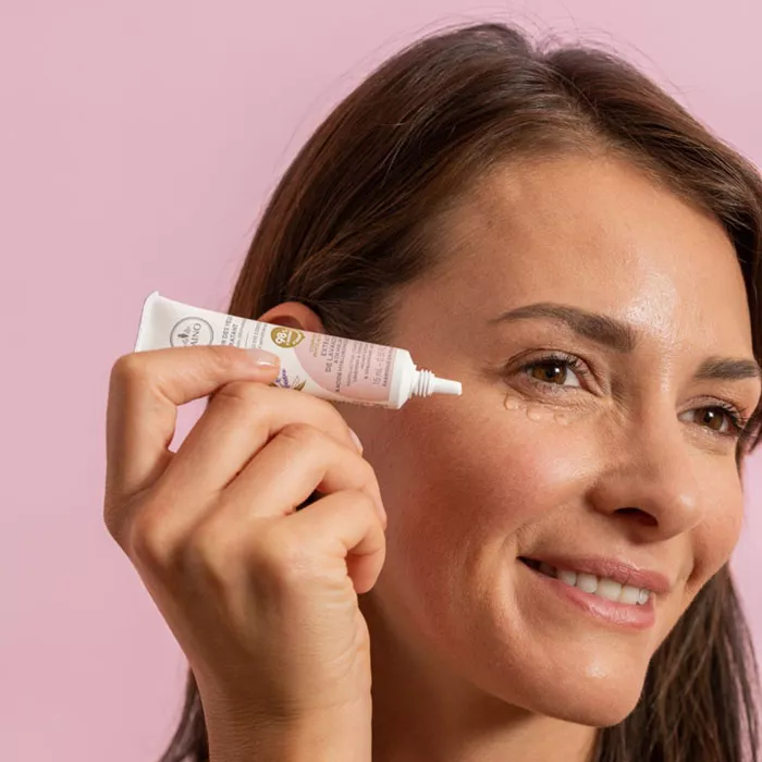 Утром нанесите гель под область вокруг глаз, деликатно разгладьте кожу движениями наружу и завершите процедуру лёгкими похлопывающими движениями.