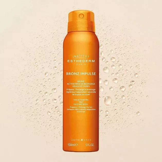 Встряхните флакон перед использованием. Распылите Institut Esthederm Bronz Impulse Spray visage & corps на лицо и тело.