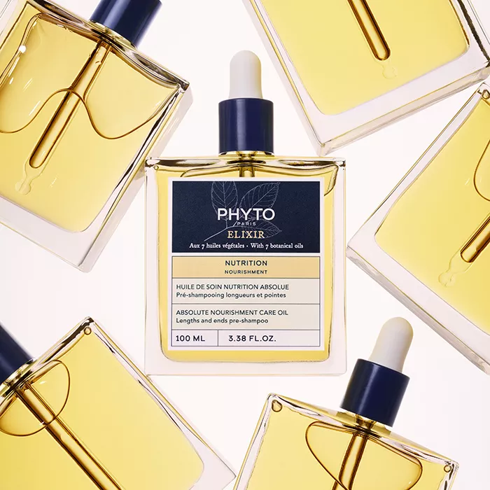 - Нанести от 2 (тонкие волосы) до 4 (густые волосы) пипеток Phyto Huile de soin Nutrition Absolue elixir на ладонь