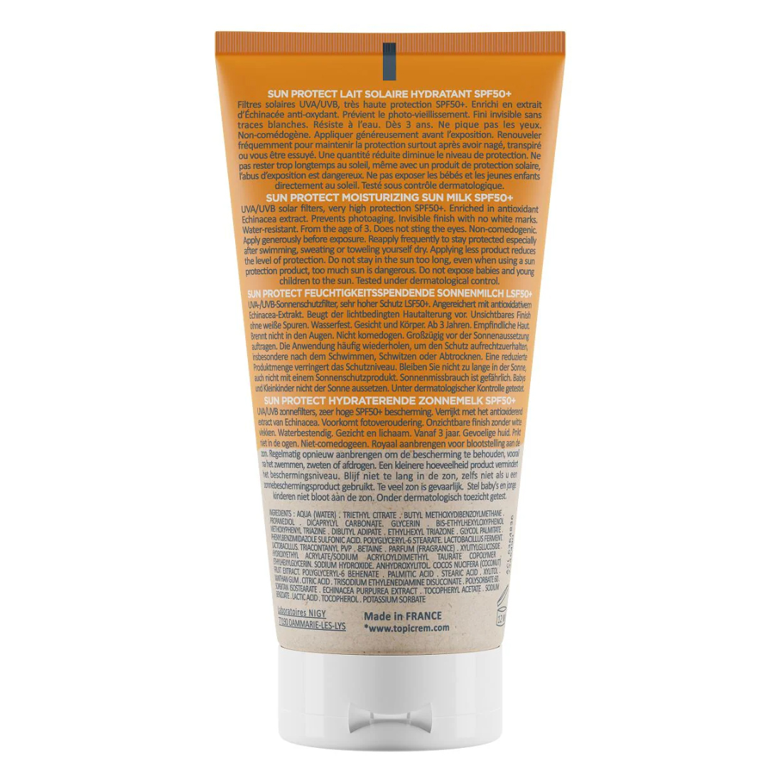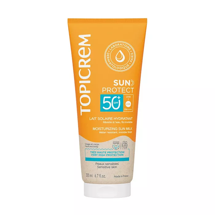 Топикрем Sun Protect Увлажняющее солнцезащитное молочко защищает чувствительную кожу всей семьи от 3-х лет благодаря органическим солнцезащитным фильтрам широкого спектра UVA/UVB лучей, обеспечивая очень высокий уровень защиты SPF50+.