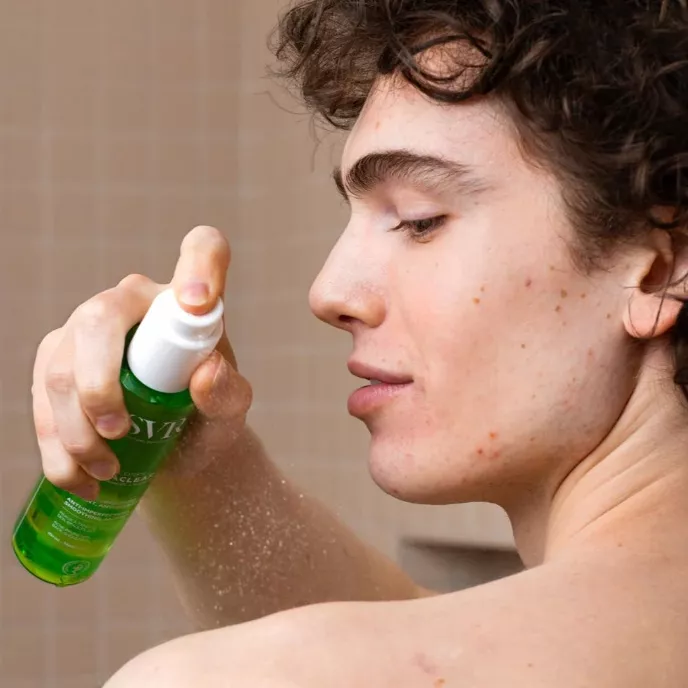 Используйте спрей самостоятельно или в сочетании с пенящимся гелем Sebiaclear.