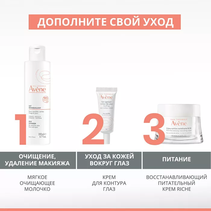 Наносите Avene Crème nutritive revitalisante riche утром и/или вечером на очищенную кожу лица и шеи.