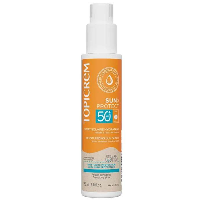 Топикрем Sun Protect Солнцезащитный увлажняющий спрей SPF50+ защищает чувствительную кожу всей семьи от 3-х лет благодаря органическим солнцезащитным фильтрам широкого спектра UVA/UVB лучей, обеспечивая очень высокий уровень защиты SPF50+.