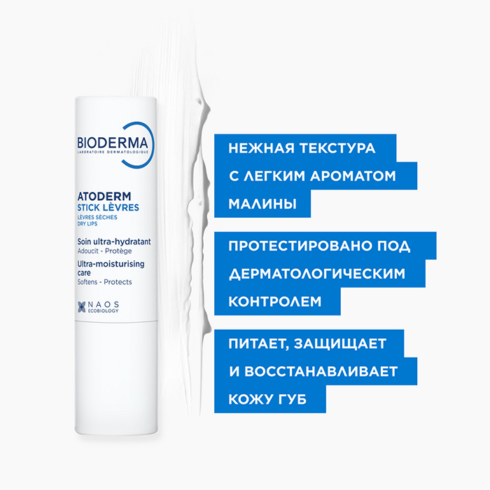 Биодерма Атодерм Питательный Стик для губ может использоваться как в качестве профилактического средства для повседневного ухода в особых климатических условиях (зимнее время, сухой воздух и т.д.), так и в качестве лечебного средства для ухода за сухой и чувствительной кожей губ.