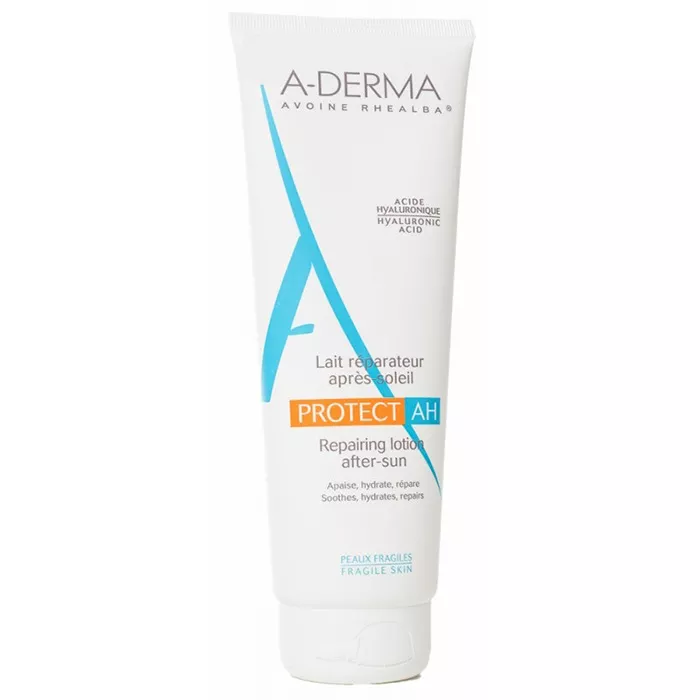 А-Дерма Протект AH Лосьон после загара интенсивно восстанавливает кожу после воздействия солнца за счёт гиалуроновой кислоты и масла ростков овса Реальба. Рекомендован для взрослых и детей, для кожи лица и тела.