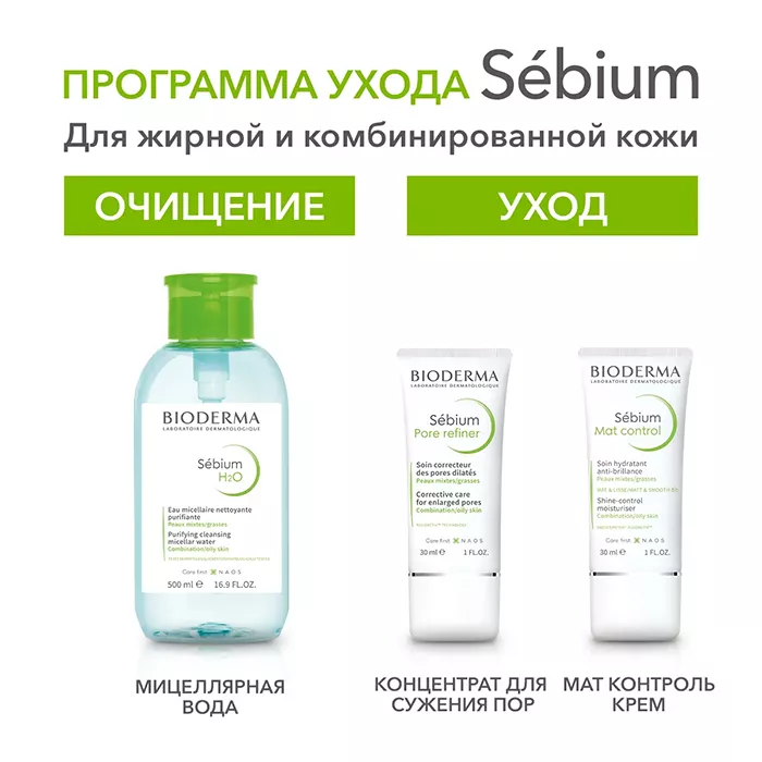 Биодерма Себиум H2O мицеллярная вода для ежедневного очищения жирной и комбинированной кожи. Обладает выраженным противовоспалительным и антимикробным действием. Значительно улучшает качество себума и препятствует образованию комедонов.