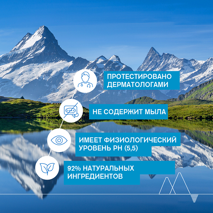 Насыщенная кремообразная текстура с лёгким ароматом образует нежную пену, которая деликатно удаляет загрязнения, не повреждая гидролипидную плёнку.