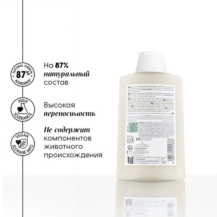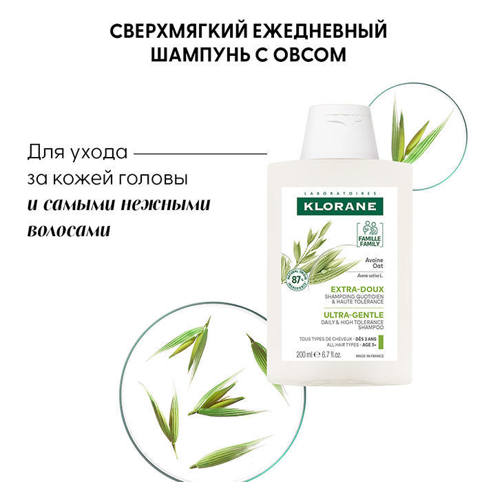 Клоран Шампунь с молочком Овса является сверхмягким уходом для всех типов волос, особенно для нормальных и сухих. Предназначен для взрослых и детей с 3-х лет.