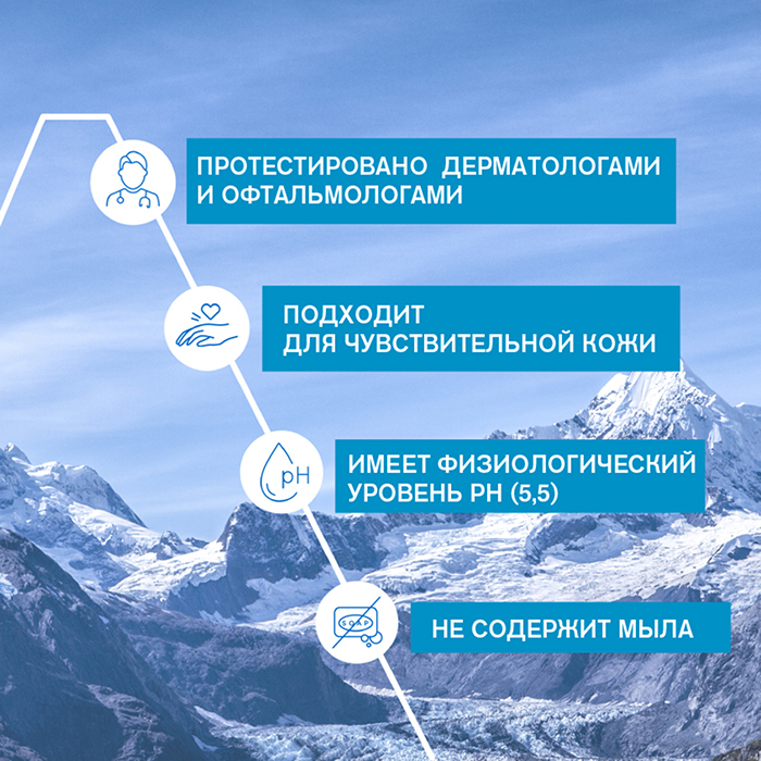 Гипоаллергенно. Физиологический ph. Офтальмологический и педиатрический контроль. Не содержит мыла, парабенов, феноксиэтанола.