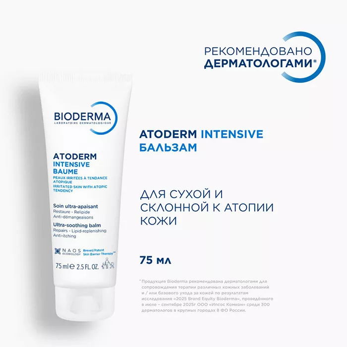 Биодерма Атодерм Бальзам Интенсив предназначен для ухода за сухой, раздражённой и атопичной кожей лица и тела в период обострения. Ликвидирует дисфункции, возникающие в структуре коже с атопическим дерматитом.