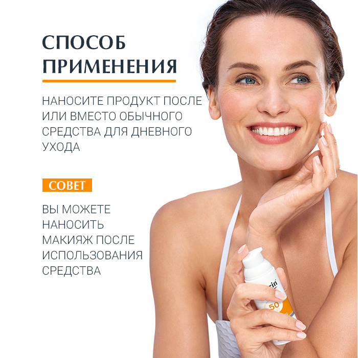 Солнцезащитный флюид с лёгкой текстурой от белого до светло-жёлтого оттенка быстро впитывается, не оставляя липкости на коже. Рекомендуется использовать после эстетических процедур (лазерная терапия, пилинги).