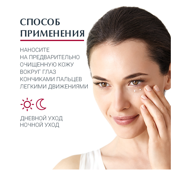 Крем с текстурой белого цвета. Регулярное использование средства делает кожу вокруг глаз более упругой, обеспечивая лифтинг-эффект. Количество морщин заметно уменьшается. Подходит для использования с контактными линзами.