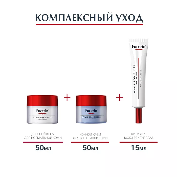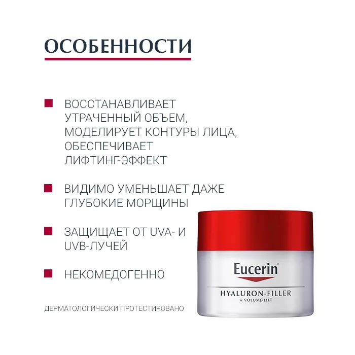 Eucerin Hyaluron-Filler+Volume-Lift Дневной крем специально разработан для устранения глубоких морщин и корректировки контуров лица в дневное время. Крем подходит для нормальной и комбинированной кожи взрослых.