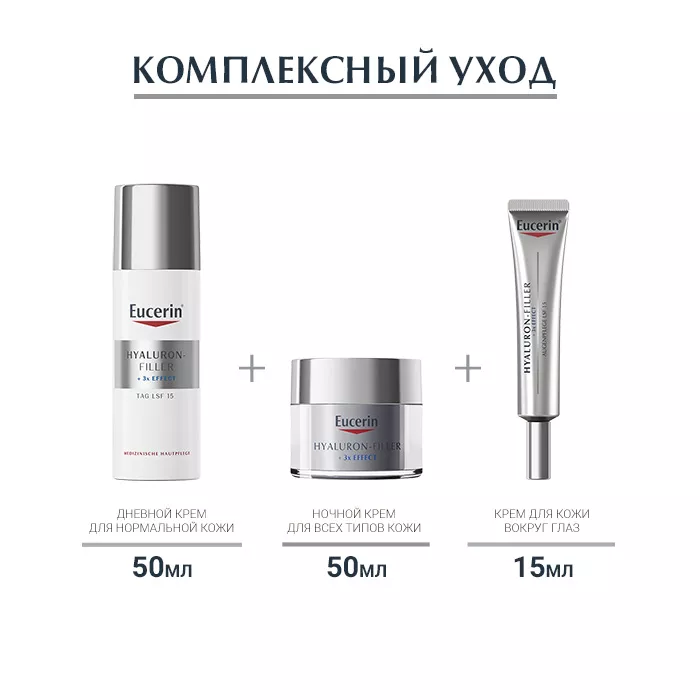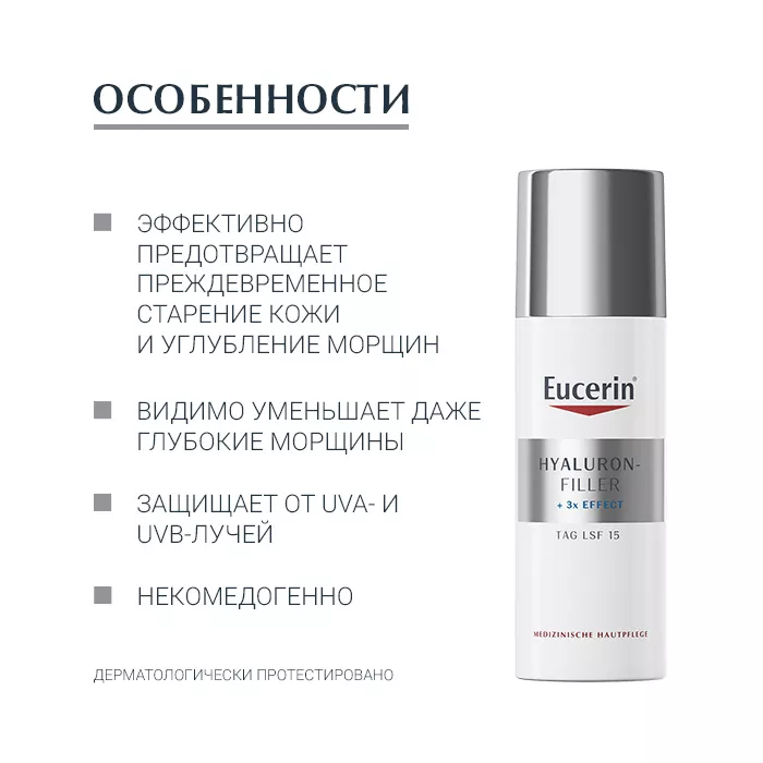 Eucerin Hyaluron-Filler Дневной крем – это усовершенствованная формула против морщин, которая сочетает высоко- и низкомолекулярную гиалуроновую кислоту, воздействующую на причину возникновения морщин. Рекомендован для нормальной и комбинированной кожи взрослых.