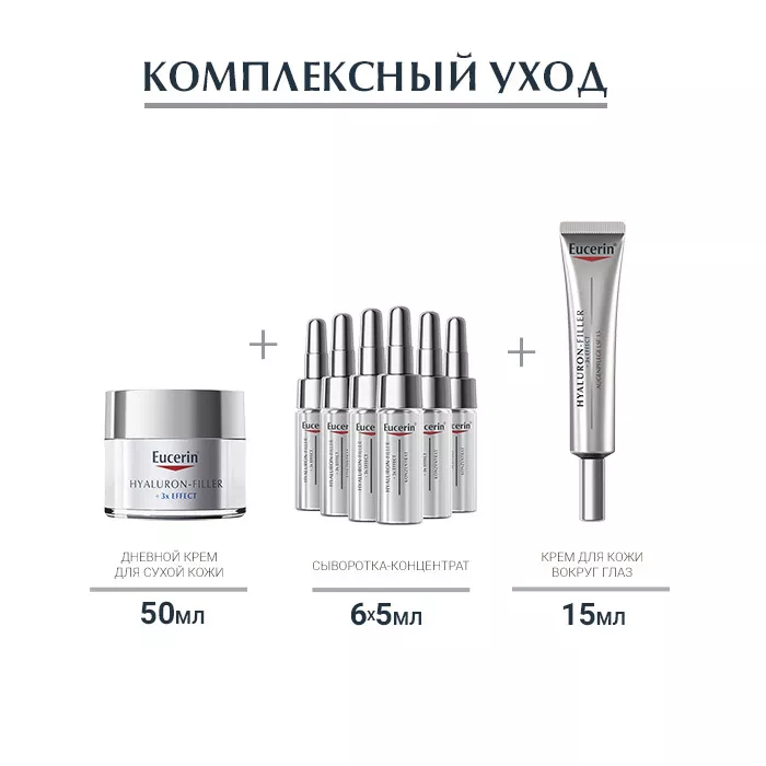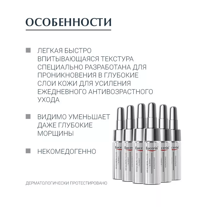 Eucerin Hyaluron-Filler Сыворотка-концентрат – это интенсивная сыворотка против морщин, предназначенная для ежедневного применения в сочетании с дневными и ночными кремами гаммы Eucerin Hyaluron-filler. Подходит для взрослых.