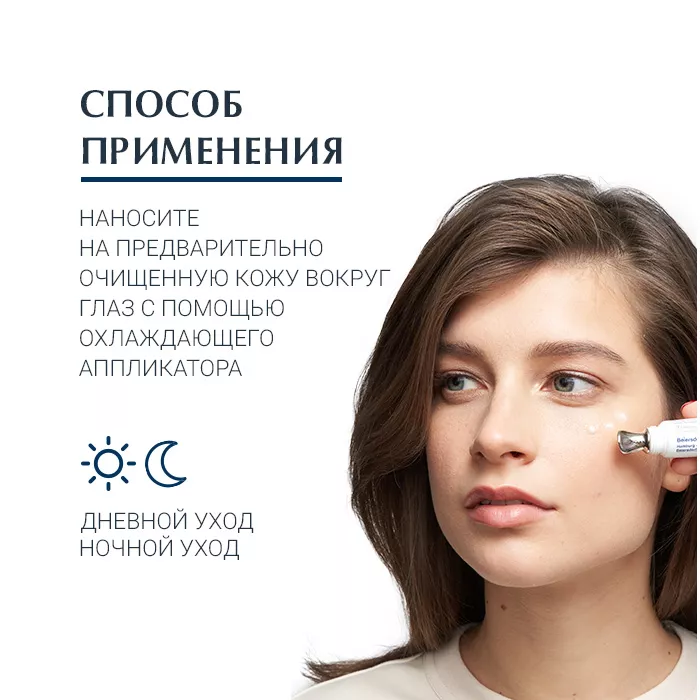 Средство обладает лёгкой, быстро впитывающейся текстурой гель-крема белого или светло-жёлтого цвета. Хорошо увлажнённая кожа выглядит гладкой и сияющей. Специальный охлаждающий аппликатор способствует устранению отёчности.