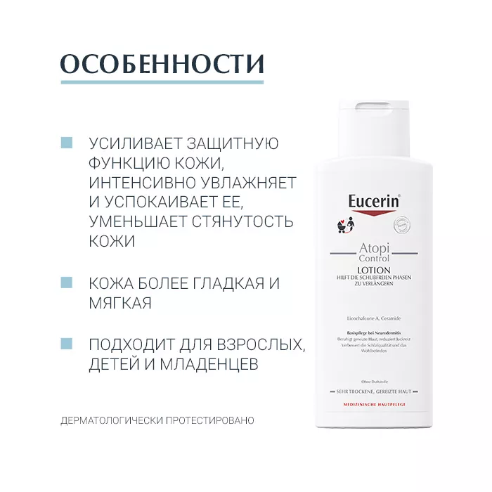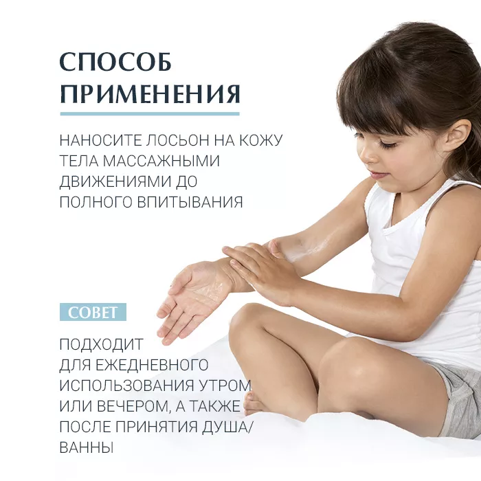 При регулярном применении лосьона с насыщенной текстурой белого цвета состояние кожи заметно улучшается, она становится мягкой и гладкой. Средство способствует здоровому сну, улучшает качество жизни людей, страдающих от атопического дерматита, так как позволяет продлить период ремиссии.