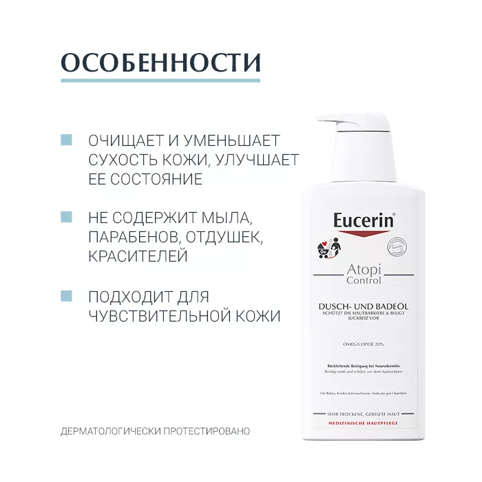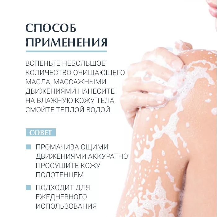 Очищающее масло с прозрачной, пенящейся при контакте с водой текстурой можно использовать ежедневно во время обострений, а также в периоды ремиссии, когда кожа менее раздражена. Масло уменьшает сухость кожи и улучшает её состояние.