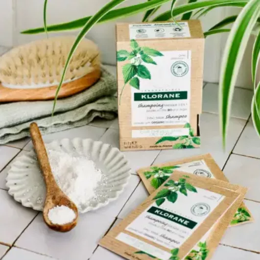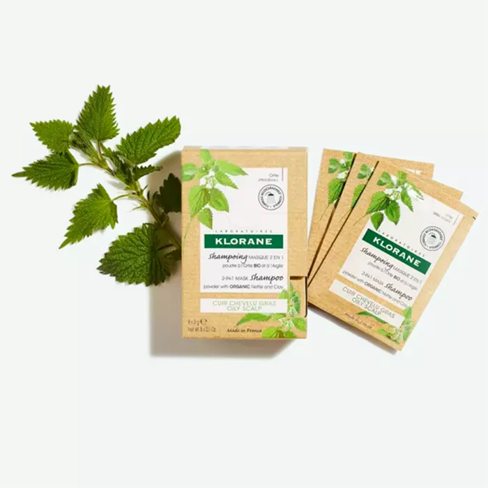 Клоран Порошковый Шампунь-маска 2-в-1 с экстрактом Крапивы и Глиной в виде порошка эффективно очищает жирные волосы за счёт экстракта крапивы и глины в составе.
