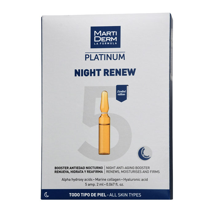 Наносите Martiderm Platinum Night Renew вечером на чистую сухую кожу в качестве первого этапа антивозрастного ухода. Нанесите 1/2 ампулы на лицо, шею и зону декольте массирующими движениями до полного впитывания.
