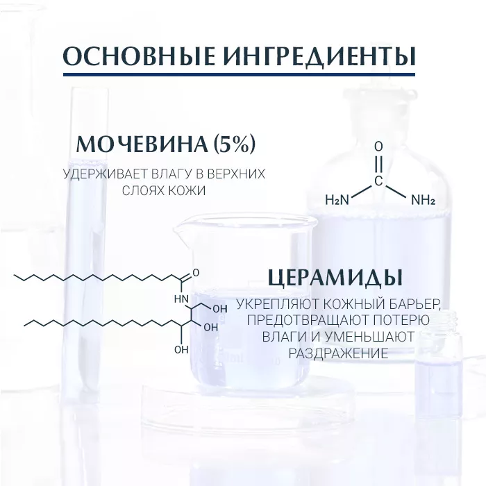 Крем с текстурой белого цвета быстро впитывается, не оставляя липкой плёнки на коже. Средство подходит для ежедневного ухода за кожей, а также для дополнительного ухода при псориазе и сахарном диабете.