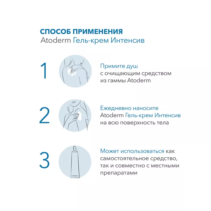 Наносите Bioderma Atoderm Intensive gel-crème на очищенную кожу лица и тела 1-2 раза в день. Можно сочетать с кортикостероидами.